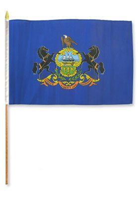 12X18 Handheld Stick Flags, 100% Polyester and Double Stiched around the edges with a 24in Wooden Pole. Sold by the dozen (pack of 12)