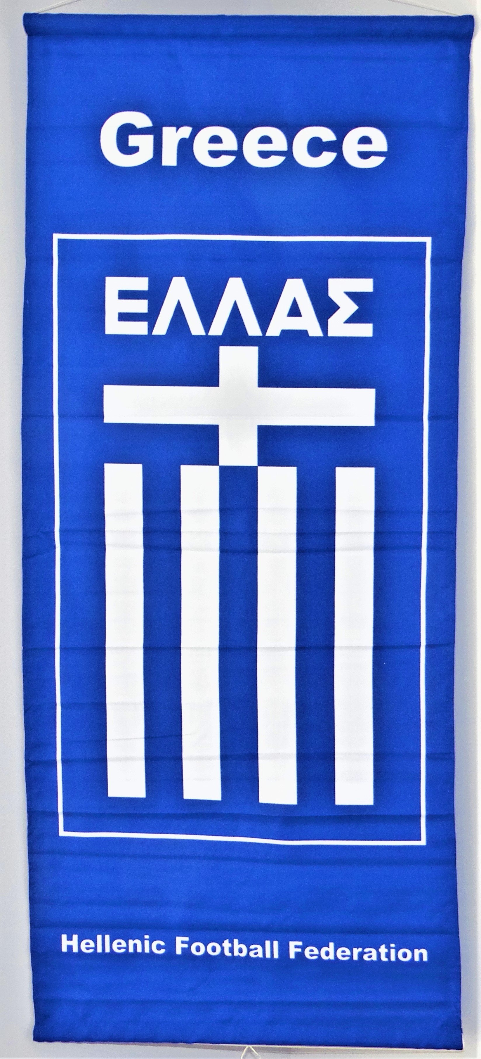 Greece Fifa style banner for wall decoration, includes an attached string for easy hanging.