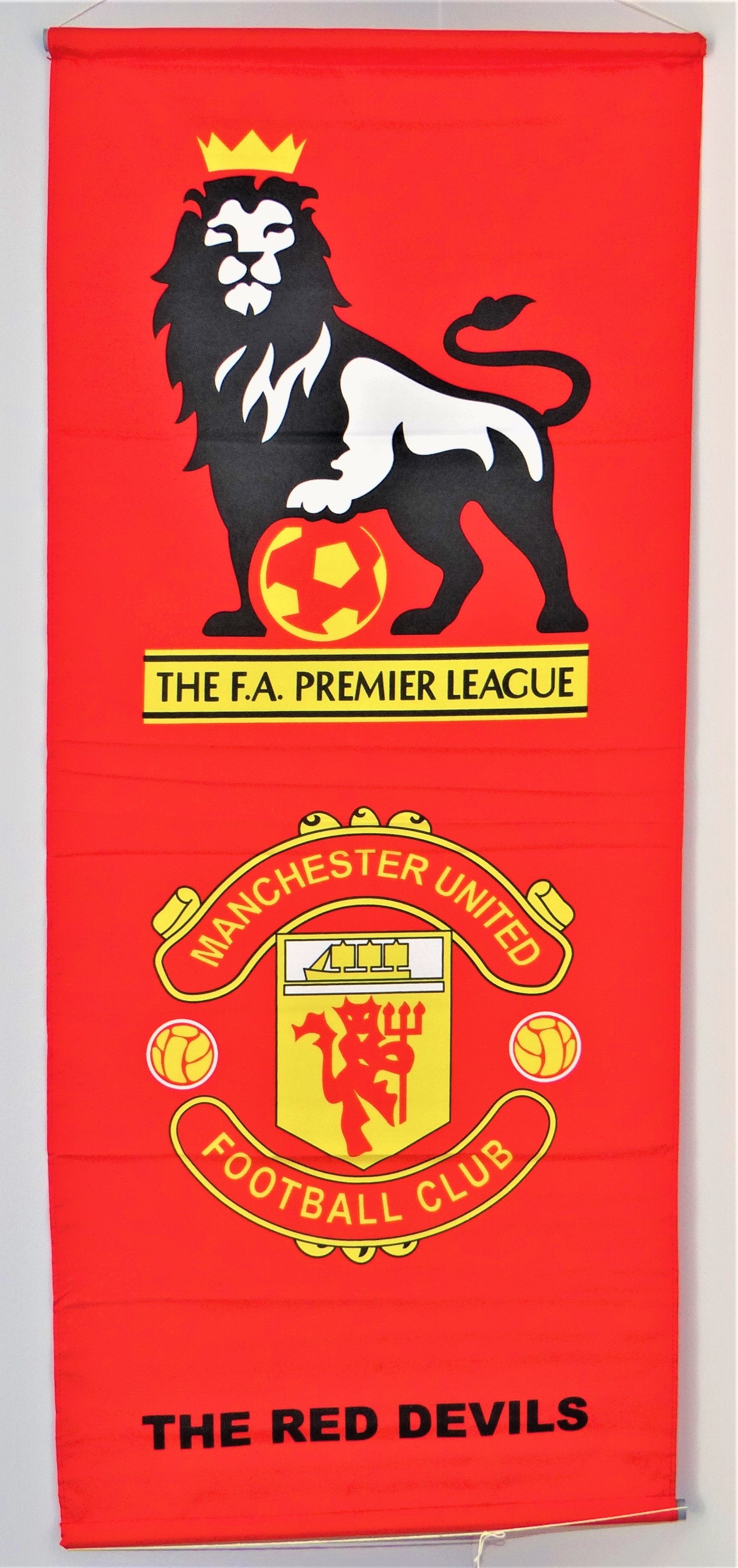 Manchester United Fifa style banner for wall decoration, includes an attached string for easy hanging.