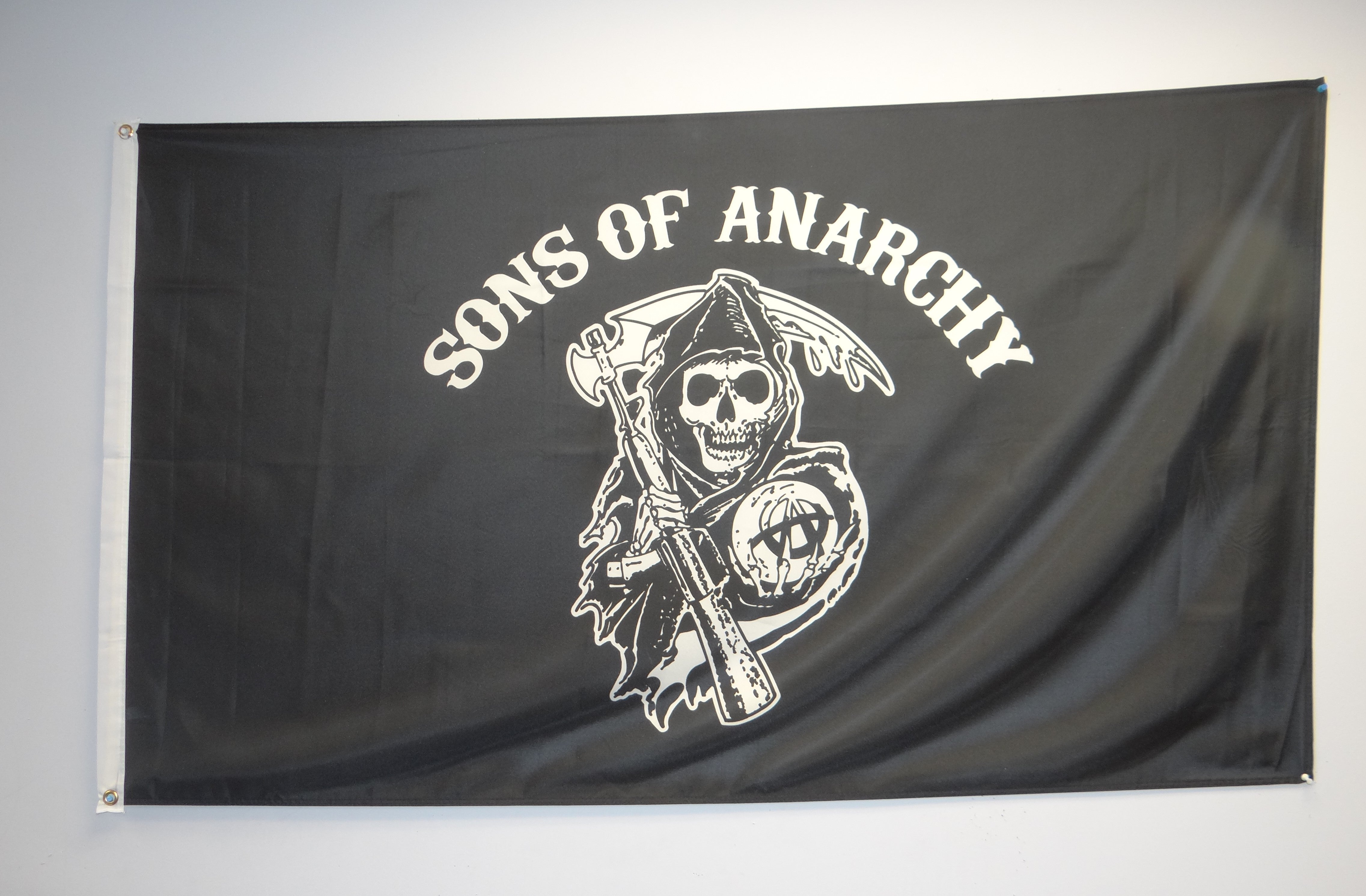 Sons Of Anarchy 3'x5' Polyester Flag, this high level quality flag is made for indoor and outdoor use. Includes two grommets for flagpoles.